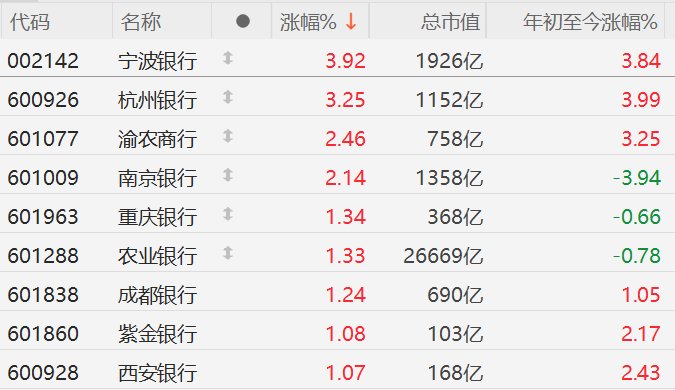 股票频道更多独家策划、专家专栏,免费查阅>> 责任编辑:栎树 1月13日,A股市场银行股普涨,其中,宁波银行、杭州银行涨超3%,渝农商行、南京银行涨超2%,重 庆银行、农业银行、成都银行、紫金银行、西安银行涨超1%。 | 代码 | 名称 | | 涨幅% ↓ | 总市值 | 年初至今涨幅%。 | | --- | --- | --- | --- | --- | --- | | 002142 | 宁波银行 | 1 | 3.92 | 1926亿 | 3.84 | | 600926 | 杭州银行 | 1 | 3.25 | 1152亿 | 3.99 | | 601077 | 渝农商行 | 1 | 2.46 | 758亿 | 3.25 | | 601009 | 南京银行 | 1 | 2.14 | 1358亿 | -3.94 | | 601963 | 重庆银行 | 1 | 1.34 | 368亿 | -0.66 | | 601288 | 农业银行 | 1 | 1.33 | 26669亿 | -0.78 | | 601838 | 成都银行 | | 1.24 | 690亿 | 1.05 | | 601860 | 紫金银行 | | ...