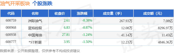 证券之星消息,11月26日油气开采板块较上一交易日下跌1.2%,*ST新潮领跌。当日上证指数报收于 3864.18,下跌0.15%。深证成指报收于12907.83,上涨1.02%。油气开采板块个股涨跌见下表: 以上内容为证券之星据公开信息整理,由AI算法生成(网信算备310104345710301240019号),不构成投资建议。 从资金流向上来看,当日油气开采板块主力资金净流出2.24亿元,游资资金净流入3885.74万元,散户资 金净流入1.85亿元。油气开采板块个股资金流向见下表: | 代码 | 名称 | | | 主力净流入(元) 主力净占比 游资净流入(元) 游资净占比 散户净流入(元) 散户净占比 | | | | | --- | --- | --- | --- | --- | --- | --- | --- | | 600759 洲际油气 | | 1786.47万 | 2.52% | -976.46万 | -1.38% | -810.01万 | -1.14% | | 000968 蓝焰控股 | | 397.59万 | 4.79% | 805.53万 | 9.71% | -1203.12万 | -14 ...