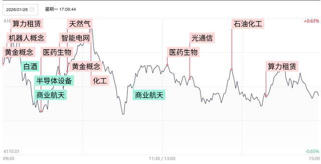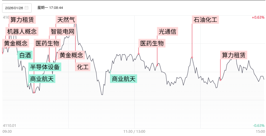 智通财经1月26日讯,今日70股涨停,40股炸板,封板率为64%,白银有色5连板,明阳智能3连板,瑞华泰20cm 2连板,九鼎新材9天5板,四川黄金8天4 板,洲际油气4天3板。市场全天震荡调整,大小指数分化明显,深成指、创业板指高开低走,盘中均一度跌超1%。沪深两市成交额3.25万亿,较上一个交 易日放量1630亿。盘面上,市场热点较为杂乱,全市场超3700只个股下跌。板块方面,有色、油气、光伏、化工板块领涨;商业航天、体育、半导体、军工 板块领跌。截至收盘,沪指跌0.09%,深成指跌0.85%,创业板指跌0.91%。 人气及连板股分析 连板晋级率降至16.67%,此前走出18连板的人气高标锋龙股份以及另一只高位人气股嘉美包装双双宣布停牌核查,对高位股方向情绪构成冲击,3板及以上 连板股家数降至仅有2只,且润贝航科、越剑智能2只2进3个股双双断板跌停。此前投机资金聚焦的弹性方向今日局部亏钱效应有所显现,随着北交所近日对 私募浩坤昇发名下证券账户限制交易3个月,拖累此前曾走出2连板的北证人气股华维设计今日收盘重挫28%。此前持续回暖的商业航天概念再遭大面积调 整,中国卫星、中国卫通等人气股跌停,随着上市公司年 ...