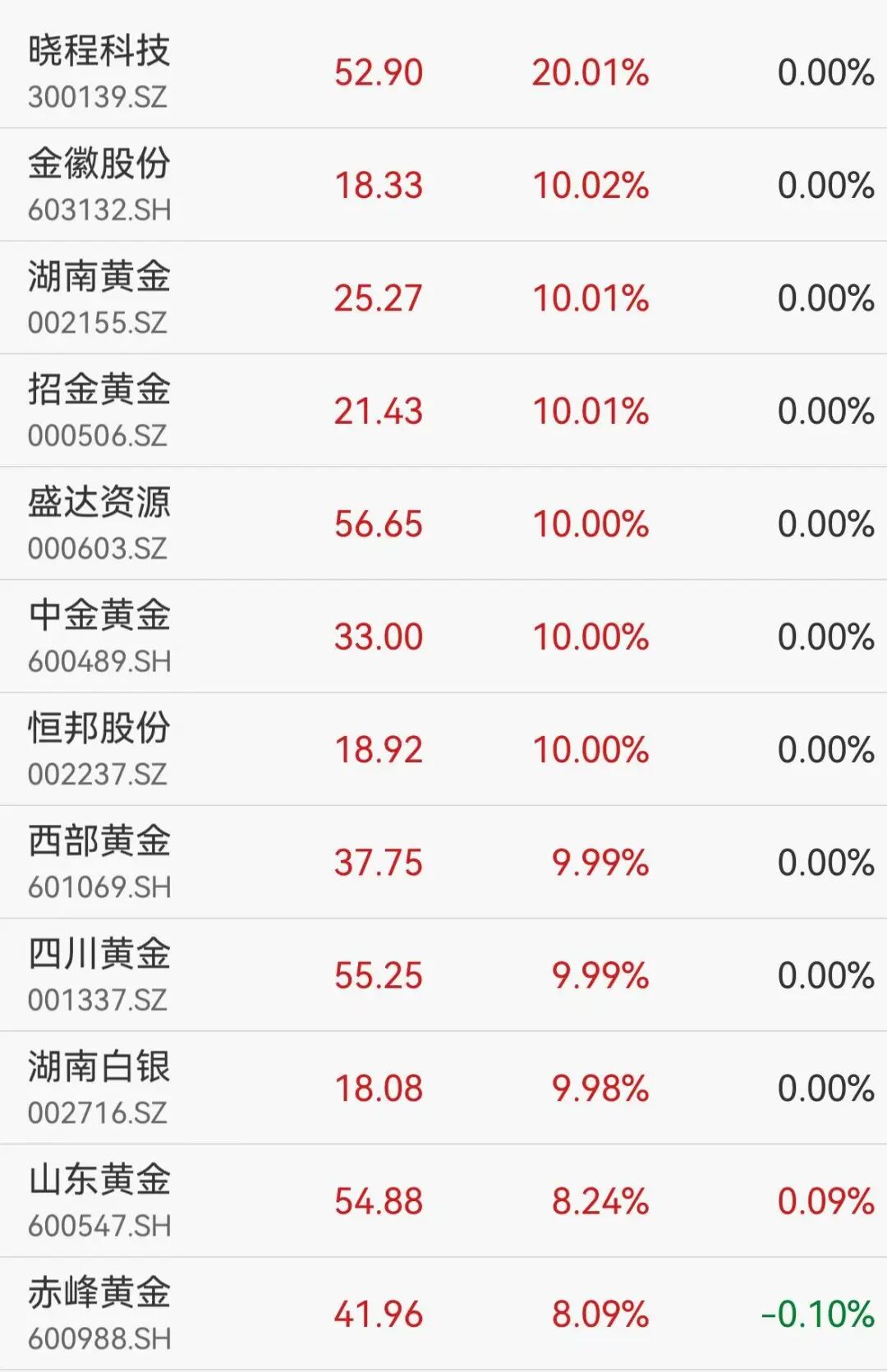 【导读】压单又来了! 中国基金报记者泰勒 大家好,今天在一系列"降温"措施之下,市场震荡下跌,一起看看发生了什么事情。 | ■伦敦银(现货白银) | | | | +4.33% | | | --- | --- | --- | --- | --- | --- | | XAG | | | | | 107.68 | | ■ 伦敦金(现货黄金) | | | | +2.05% | | | XAU | | | | | 5088.25 | | 1445 | 白树 | | · | 工程11 | | | 300139 | 晓程科技 | R | 20.01 | 52.90 | | | 002155 | 湖南黄金 | R | 10.01 | 25.27 | | | 000506 | 招金黄金 | | 10.01 | 21.43 | | | 600489 | 中金黄金 | R | 10.00 | 33.00 | | | 002237 | 恒邦股份 | R | 10.00 | 18.92 | | | 000603 | 盛达资源 | R | 10.00 | 56.65 | | | 601069 | 西部黄金 | R | 9.99 | 37 ...