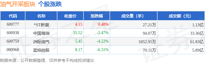 | 代码 | 名称 | | | 主力净流入(元) 主力净占比 游资净流入(元) 游资净占比 散户净流入 (元) 散户净占比 | | | | | --- | --- | --- | --- | --- | --- | --- | --- | | 600777 | *ST新潮 | 386.69万 | 3.42% | -987.36万 | -8.72% | 600.67万 | 5.30% | | 000968 蓝焰控股 | | -2341.97万 | -3.98% | 369.69万 | 0.63% | 1972.28万 | 3.35% | | 800938 中国海油 | | -2.74亿 | -8.22% | 1147.29万 | 0.34% | 2.63亿 | 7.87% | | 600759 洲际油气 | | -8.63亿 | -13.97% | 1.13亿 | 1.84% | 7.50亿 | 12.13% | 以上内容为证券之星据公开信息整理,由AI算法生成(网信算备310104345710301240019号),不构成投资建议。 | 代码 | 名称 | 收盘价 | 涨跌幅 | 成交量(手) | 成交额(元 ...