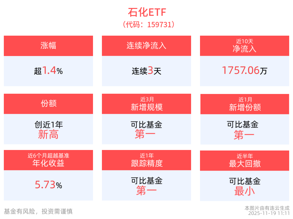 中信证券研报称,化工板块目前主要围绕三大主线进行交易:1)储能需求带动产业链景气度提升,上游锂电等材料供需格局有望重塑,重点推荐新能源相 关的材料标的、六氟磷酸锂、磷酸铁及磷酸铁锂产业链;2)化工反内卷持续加码,多行业发起行业自律,化工品价格有望底部回暖;3)化工品行业自身高 景气,主营业务有望保持高增长。 石化ETF紧密跟踪中证石化产业指数,数据显示,截至2025年10月31日,中证石化产业指数前十大权重股分别为万华化学、中国石油、盐湖股份、中国石 化、中国海油、巨化股份、藏格矿业、金发科技、宝丰能源和华鲁恒升,前十大权重股合计占比56.05%。 | 股票代码 | 股票简称 | 涨跌幅 | 权重 | | --- | --- | --- | --- | | 600309 | 万华化学 | -0.37% | 10.47% | | 601857 | 中国石油 | 4.05% | 7.63% | | 000792 | 盐湖股份 | 5.58% | 6.44% | | 600028 | 中国石化 | 4.83% | 6.44% | | 600938 | 甲国海海 | 2.97% | 5.22% | | 600160 ...