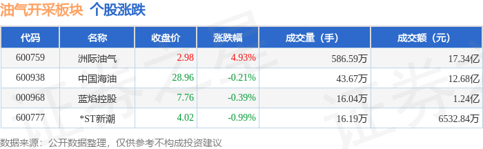 证券之星消息,11月17日油气开采板块较上一交易日上涨0.09%,洲际油气领涨。当日上证指数报收于 3972.03,下跌0.46%。深证成指报收于13202.0,下跌0.11%。油气开采板块个股涨跌见下表: | 代码 | 名称 | 主力净流入 (元) | | | | 主力净占比 游资净流入(元) 游资净占比 散户净流入 (元) 散户净占比 | | | | --- | --- | --- | --- | --- | --- | --- | --- | --- | | 600759 洲际油气 | | | 1.18亿 | 6.82% | 10.30万 | 0.01% | -1.18 Z | -6.82% | | 000968 蓝焰控股 | | | 661.01万 | 5.31% | -752.47万 | -6.05% | 91.46万 | 0.74% | | 600938 中国海油 | | | -1584.94万 | -1.25% | 203.87万 | 0.16% | 1381.08万 | 1.09% | | 600777 | *ST新潮 | | -1585.92万 | -24.28% | 1115.31万 | ...