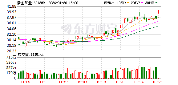 | 九转 重大事件 演 加 权 超级叠加 窗 区 信息 ● ▼ | | 紫金矿业 601899 | 6 23 | | --- | --- | --- | --- | | 20251113-20260126 (51) 금 | 41.25 | 39.50 +1.94 +5.17% 困 | | | 40.48- | | 港(HK2899) 42.18 +4.35% H/A -4.73% | | | 39.06 | 委比 | -97.25% | -1016594 | | | 5 | 39.54 | 197 | | 36.88 | | 39.53 | 459 | | 34.70 | | 39.52 | 750 | | | | 39.51 | 343 | | 32.52 | | 39.50 | 1029222 | | 30.33 | | 39.49 | 4253 | | | | 39.48 | 4755 | | 28.15 | | 39.47 | 1101 | | | | 39.46 | 1250 | | 66351 | 5 | 39.45 | 3018 | | | 现价 | 39.50 涨跌 | +1.94 | | 2 ...