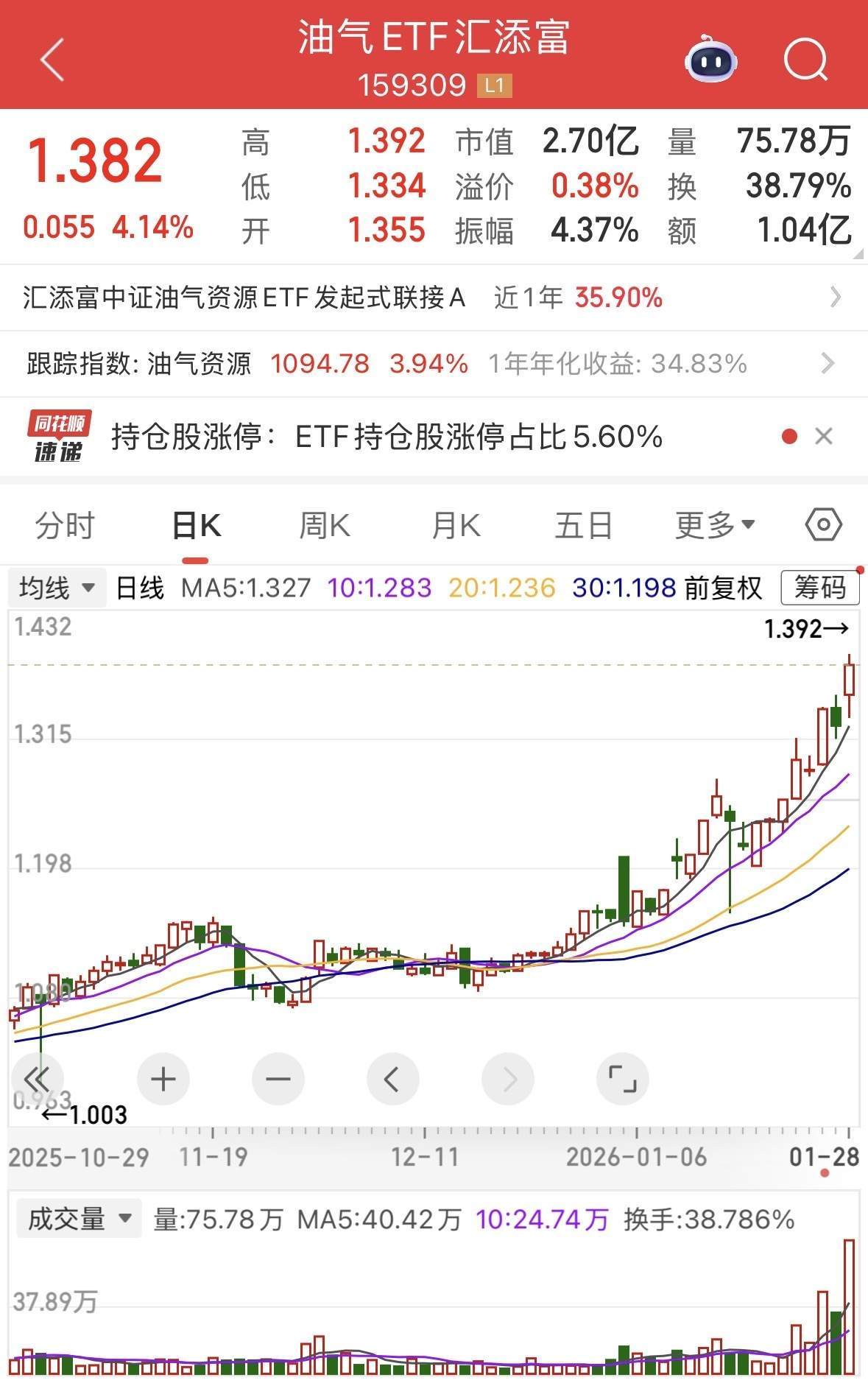 1月28日,国际油价迎来强势反弹,布油站上三个月新高、美油突破62美元/桶!油气股盘中再度活跃,石化油服直线涨停,中国海油涨超7%,续创历史新 高。截至尾盘,油气ETF汇添富(159309)飙涨超4%,创历史新高!盘中再获超9000万元净申购,此前连续10日"吸金"合超1.5亿元。 | 油气ETF汇添富 | | | | | | --- | --- | --- | --- | --- | | | 159309 | | | ਨੇ | | | | | | 10 + | | 交生 | 19.95% 120日 | | 41.27% | | | 5日 9.76% | 250日 | 40.41% | | | | 20日 19.33% | 52周高 | | | 1.36 | | 25.61% 52周低 60日 | | | | 0.81 | | 实时申购赎回信息 | 申购 | | | 岐口 | | 筆数 | ਦੇਤ | | | 0 | | 金额 | 0 | | | 0 | | 份额 | 6700万 | | | 0 | | 印度 上 | | | | | | 最小申赎单位份额 | | 1,000,000 | | | | 现金替代比 ...