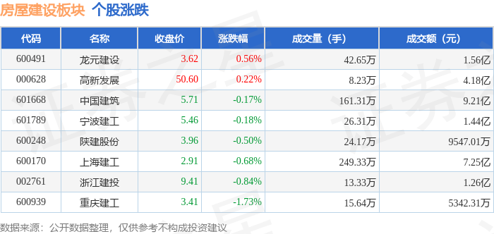 证券之星消息,10月20日房屋建设板块较上一交易日上涨0.33%,高新发展领涨。当日上证指数报收于 3863.89,上涨0.63%。深证成指报收于12813.21,上涨0.98%。房屋建设板块个股涨跌见下表: | 代码 | 名称 | 收盘价 | 涨跌幅 | 成交量(手) | 成交额(元) | | --- | --- | --- | --- | --- | --- | | 000628 | 高新发展 | 49.76 | 2.01% | 6.23万 | 3.10亿 | | 600491 | 龙元建设 | 3.43 | 1.18% | 16.05万 | 5484.37万 | | 601789 | 宁波建工 | 5.40 | 1.12% | 21.98万 | 1.18亿 | | 600170 | 上海建工 | 2.86 | 0.70% | 283.43万 | 8.08亿 | | 002761 | 浙江建投 | 9.12 | 0.66% | 8.44万 | 7678.45万 | | 600939 | 重庆建工 | 3.26 | 0.62% | 9.13万 | 2962.93万 | | 601668 | 中国建筑 | 5 ...