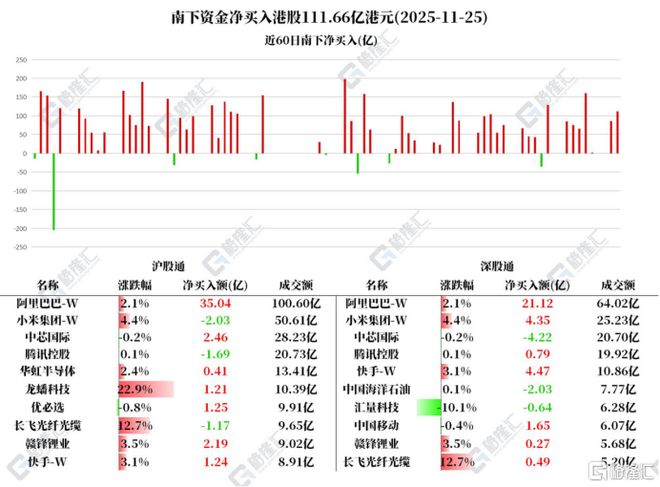 11月25日,南下资金今日净买入港股111.66亿港元。 北水关注个股 其中:净买入阿里巴巴-W 56.16亿、快手-W 5.71亿、赣锋锂业2.46亿、小米集团-W 2.31亿、中国移动 1.64亿、优必选1.25亿、龙蟠科技1.2亿;净卖出中国海洋石油2.02亿、中芯国际1.76亿。 小米:中信建投认为,目前实现盈利的新能源车企仍属少数,中国新能源汽车行业在经历多年高速扩张 后正进入整合出清的关键阶段,盈利能力成为下一阶段竞争的核心指标。小米汽车的规模化盈利表明头 部玩家正通过技术自研、供应链整合与组织效率的提升推动经营模型走向成熟。展望未来两年,具备垂 直整合能力、软件生态优势及成本控制优势的企业有望进一步拉大差距,行业竞争将从"扩张比拼"转 向"效率驱动"的新一轮结构性分化周期。 据统计,南下资金已连续9日净买入阿里,共计230.03亿港元;连续3日净买入小米,共计19.8355亿港 元;连续3日净买入快手,共计16.2632亿港元;连续4日净卖出中芯国际,共计14.09亿港元。 快手:港交所公告显示,11月25日以每股45.100港元至46.650港元的价格回购200.00万股,回购金额达 9187 ...