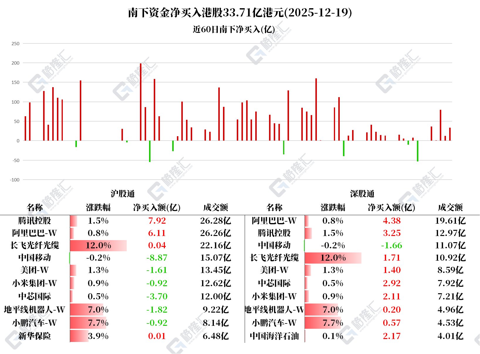 格隆汇12月19日|南下资金今日净买入港股33.71亿港元。其中: 据统计,南下资金已连续16日净买入小米,共计148.6946亿港元;连续4日净买入腾讯,共计18.7984亿港元;连续6日净卖出中国移动,共计39.3882亿港 元。(格隆汇) | 名称 | 沪股通 涨跌幅 | 净买入额(亿) | 成交额 | 名称 | | --- | --- | --- | --- | --- | | 腾讯控股 | 1.5% | 7.92 | 26.28 Z | 阿里巴巴-W | | 阿里巴-W | 0.8% | 6.11 | 26.26 Z | 腾讯控股 | | 长飞光纤光缆 | 12.0% | 0.04 | 22.16 Z | 中国移动 | | 中国移动 | -0.2% | -8.87 | 15.07 Z | 长飞光纤光缆 | | 美团-W | 1.3% | -1.61 | 13.45 Z | 美团-W | | 小米集团-W | 0.9% | -0.92 | 12.62亿 | 中心国际 | | 中芯国际 | 0.5% | -3.70 | 12.00 Z | 小米集团-W | | 地平线机器人-W | 7.0% | -1. ...
