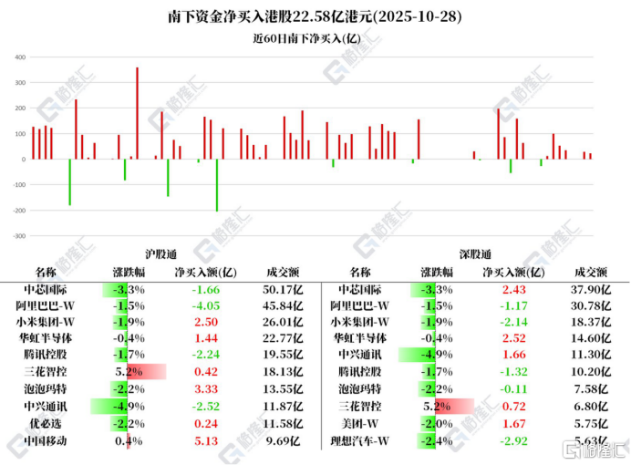 中国移动(00941)获净买入5.12亿港元。消息面上,根据智通财经,2025中国移动全球合作伙伴大会上,中国移动发 布"AI+"行动计划,到2028年底,中国移动对人工智能领域的总体投入翻一番,建成国内规模最大的智算基础设施,探索 十万卡智算集群建设,全国产智能算力规模突破100EFLOPS。国金证券表示,看好AI业务给公司带来的高成长潜力。 智通财经APP获悉,10月28日港股市场,北水成交净买入22.58亿港元,其中港股通(沪)成交净买入18.12亿港元,港股通 (深)成交净买入4.46亿港元。 北水净买入最多的个股是中国移动(00941)、华虹半导体(01347)、泡泡玛特(09992)。北水净卖出最多的个股是阿里巴巴- W(09988)、腾讯(00700)、理想汽车-W(02015)。 | 股票名称 | 买入额 | 卖出额 | 买卖总额 | | --- | --- | --- | --- | | | | | 净流入 | | 中芯国际 HK 00981 | 24.25 乙 | 25.91 乙 | 50.17 亿 | | | | | -1.66 亿 | | 阿里巴巴-W HK 09988 | 20.89 ...