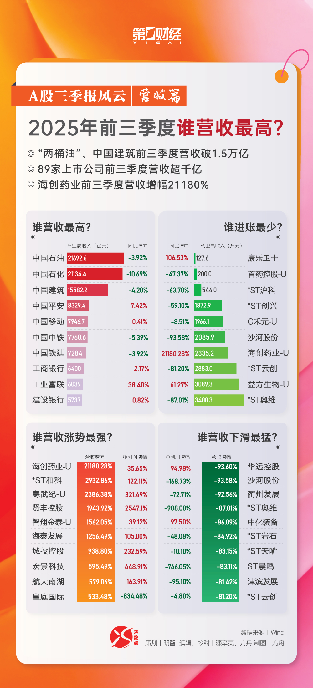 - 谁赚钱最多? - 谁发红包最壕? - 哪个行业最吃香? …… | 旺昌 X取同! | | | | | ただ人気 | | --- | --- | --- | --- | --- | --- | | 营业总收入(亿元) | | 同比增幅 | 同比增幅 | 营业总收入(万元) | | | 中国石油 21692.6 | | -3.92% | 106.53% | 127.6 | 康乐卫士 | | 中国石化 | 21134.4 | -10.69% | -47.37% | 200.0 | 首药控股-U | | 中国建筑 | 15582.2 | -4.20% | -63.70% | 544.0 | *ST沪科 | | 中国平安 | 8329.4 | 7.42% | -59.10% | 1872.9 | *ST创兴 | | 中国移动 | 7946.7 | 0.41% | -8.51% | 1966.1 | C禾元-U | | 中国中铁 | 7760.6 | -5.39% | -93.58% | 2085.9 | 沙河股份 | | 中国铁建 | 7284 | -3.92% | 21180.28% | 2335.2 | 海创药 ...