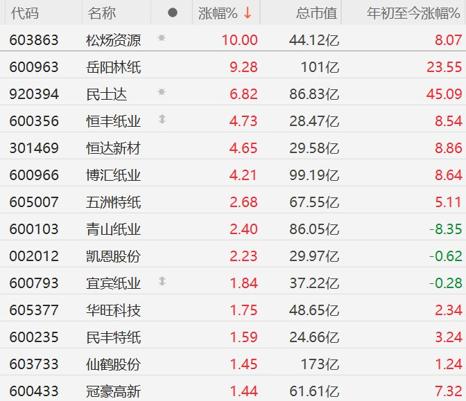 | 代码 | 名称 | | 涨幅% ↓ | 总市值 | 年初至今涨幅% | | --- | --- | --- | --- | --- | --- | | 603863 | 松炀资源 | 兼 | 10.00 | 44.12亿 | 8.07 | | 600963 | 岳阳林纸 | | 9.28 | 101亿 | 23.55 | | 920394 | 民达 | 事 | 6.82 | 86.83 Z | 45.09 | | 600356 | 恒丰纸业 | 1 | 4.73 | 28.47 亿 | 8.54 | | 301469 | 恒达新材 | | 4.65 | 29.58亿 | 8.86 | | 600966 | 博汇纸业 | | 4.21 | 99.19亿 | 8.64 | | 605007 | 五洲特纸 | | 2.68 | 67.55亿 | 5.11 | | 600103 | 青山紙业 | | 2.40 | 86.05亿 | -8.35 | | 002012 | 凯恩股份 | | 2.23 | 29.97亿 | -0.62 | | 600793 | 宜宾纸业 | 1 | 1.84 | 37.22 乙 | - ...