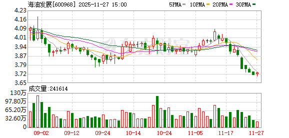 Group 1 - The stock price of CNOOC Development fell by 2.22% on November 13, trading at 3.97 yuan per share with a total market capitalization of 40.355 billion yuan [1] - The company has seen a year-to-date stock price decline of 3.99%, with a slight increase of 0.51% over the last five trading days [1] - CNOOC Development's main business segments include energy logistics services (51.51% of revenue), energy technology services (35.37%), and low-carbon environmental and digital services (17.13%) [1] Group 2 - As of September 30, the number of shareholders for CNOOC Development increased by 10.86% to 74,000, while the average circulating shares per person decreased by 9.79% to 137,449 shares [2] - For the period from January to September 2025, CNOOC Development reported a revenue of 33.947 billion yuan, reflecting a year-on-year growth of 0.81%, and a net profit attributable to shareholders of 2.853 billion yuan, up 6.11% year-on-year [2] Group 3 - Since its A-share listing, CNOOC Development has distributed a total of 4.747 billion yuan in dividends, with 3.354 billion yuan distributed over the past three years [3] - As of September 30, 2025, the second-largest circulating shareholder is Hong Kong Central Clearing Limited, holding 100 million shares, a decrease of 5.92672 million shares from the previous period [3]