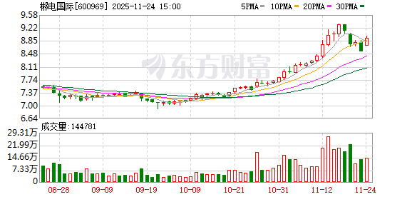证券之星消息,截至2025年11月24日收盘,郴电国际(600969)报收于8.93元,上涨4.69%,换手率 3.91%,成交量14.48万手,成交额1.29亿元。 11月24日的资金流向数据方面,主力资金净流出175.22万元,占总成交额1.36%,游资资金净流入 692.37万元,占总成交额5.37%,散户资金净流出517.15万元,占总成交额4.01%。 该股主要指标及行业内排名如下: | 指标 | 郴电国际 | 电力行业均值 | 行业排名 | | --- | --- | --- | --- | | 总市值 | 33.05亿元 | 408.87亿元 | 81 83 | | 净资产 | 39.95亿元 | 352.93亿元 | 64 83 | | 净利润 | 8096.75万元 | 20.8亿元 | 71 83 | | 市盈率(动) | 30.61 | -9.94 | 61 83 | | 市净率 | 0.91 | 2.36 | 11 83 | | 毛利率 | 9.29% | 30.48% | 78 83 | | 净利率 | 3.6% | 19.57% | 72 83 | | ROE | 2.25% | ...