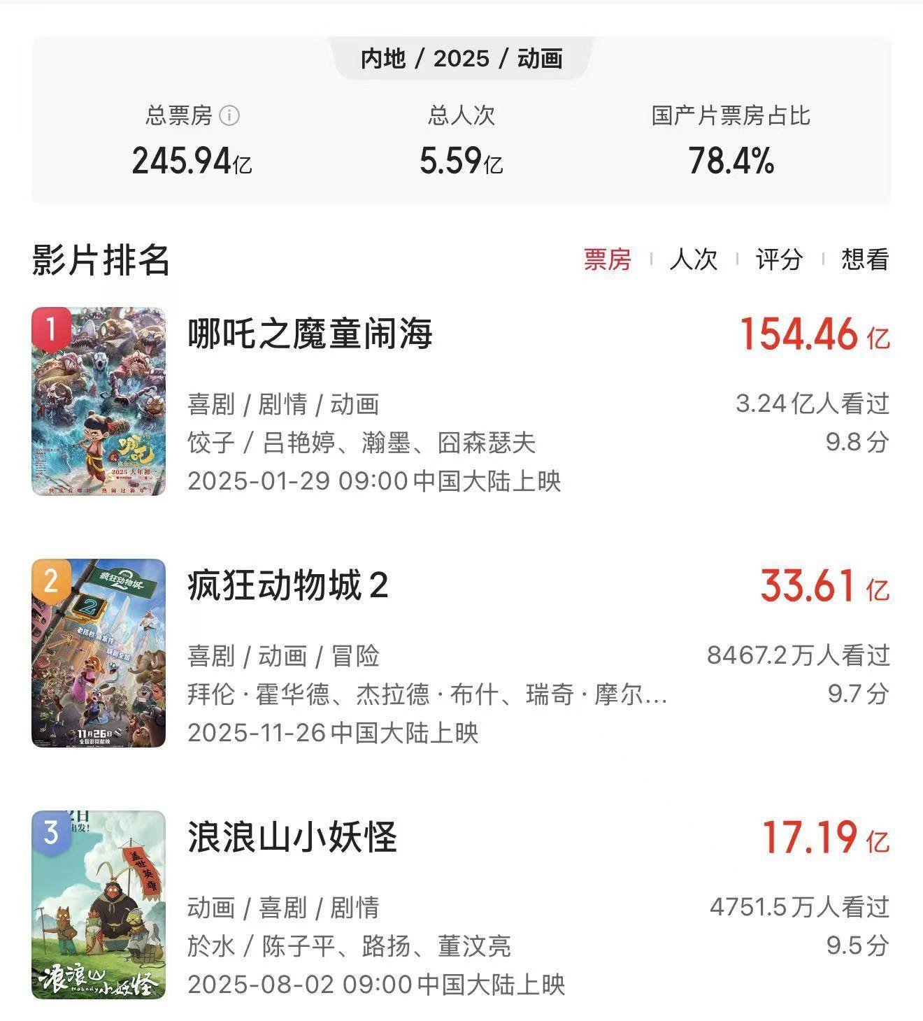 明星光环褪色!2025中国电影票房破500亿元:动画电影贡献近一半