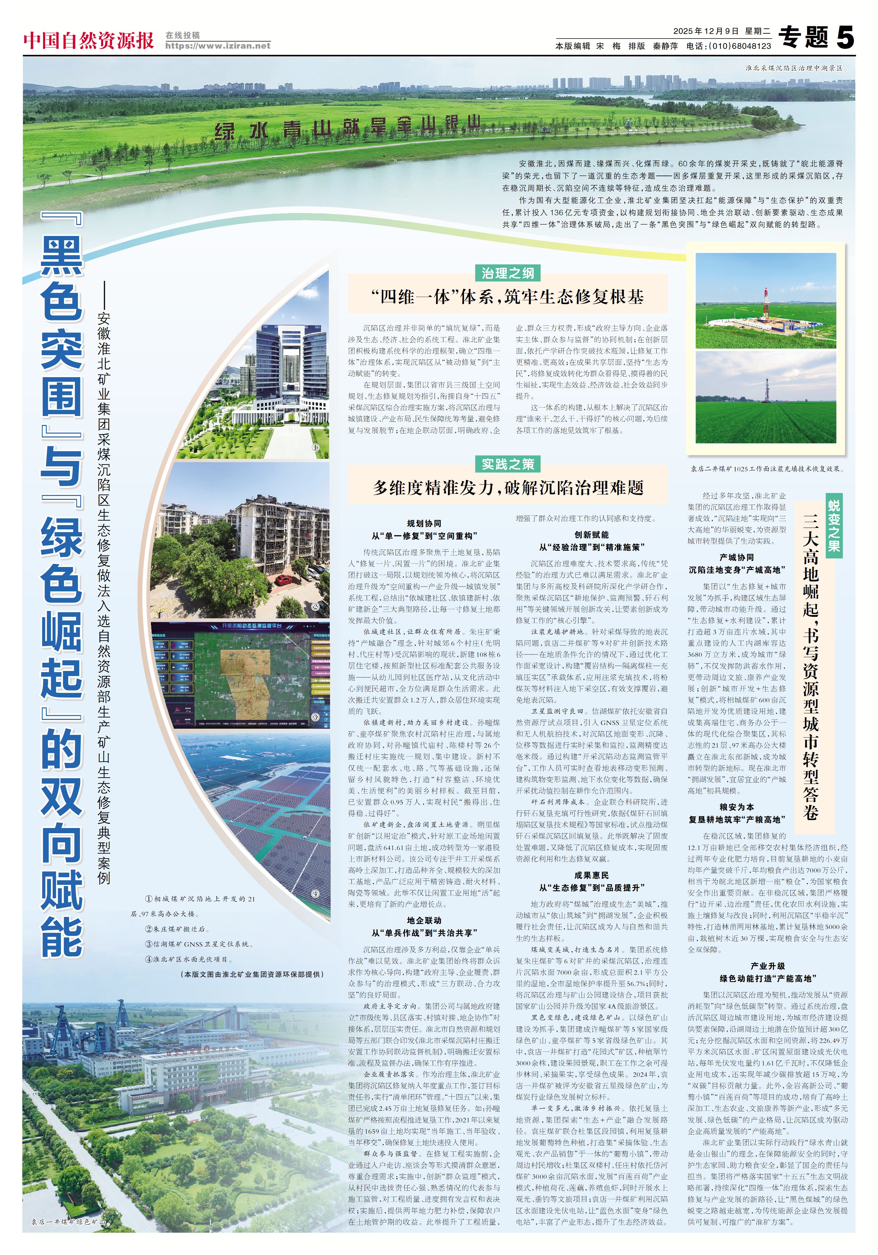 中国自然资源报 在线投稿 https://www.iziran.net 安徽淮北矿业集团采煤沉 nh 生态修复做法人选自然资源部生产矿山生态修复典型案 EED E 跑吸回顾 台灣 1相城煤矿沉陷地上开发的 21 层、97米高办公大楼。 2朱庄煤矿搬迁后。 3信湖煤矿 GNSS卫星定位系统。 4淮北矿区水面光伏项目。 安徽淮北,因煤而建、缘煤而兴、化煤而绿。60余年的煤炭开采史,既铸就了"皖北能源脊梁"的荣光,也留下了一道沉重的生态考题——因多 煤层重复开采,这里形成的采煤沉陷区,存在稳沉周期长、沉陷空间不连续等特征,造成生态治理难题。 作为国有大型能源化工企业,淮北矿业集团坚决扛起"能源保障"与"生态保护"的双重责任,累计投入136亿元专项资金,以构建规划衔接协 同、地企共治联动、创新要素驱动、生态成果共享"四维一体"治理体系破局,走出了一条"黑色突围"与"绿色崛起"双向赋能的转型路。 淮北采煤沉陷区治理中湖景区 治理之纲 "四维一体"体系,筑牢生态修复根基 沉陷区治理并非简单的"填坑复绿",而是涉及生态、经济、社会的系统工程。淮北矿业集团积极构建系统科学的治理框架,确立"四维一体"治 理体系,实现沉陷区从" ...