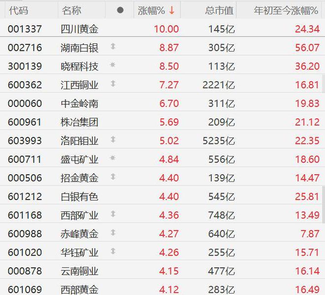 股票频道更多独家策划、专家专栏,免费查阅>> 消息面上,现货黄金一度涨至4643美元/盎司,创历史新高;现货白银一度突破93美元/盎司,再创历史 新高。 | 代码 | 名称 | | 涨幅% ↓ | 总市值 | 年初至今涨幅% | | --- | --- | --- | --- | --- | --- | | 001337 | 四川黄金 | | 10.00 | 145亿 | 24.34 | | 002716 | 湖南日银 | 1 | 8.87 | 305亿 | 56.07 | | 300139 | 晓程科技 | 长 | 8.50 | 113亿 | 36.20 | | 600362 | 江西铜水 | � | 7.27 | 2221亿 | 16.81 | | 000060 | 中等岭南 | | 6.70 | 311亿 | 19.83 | | 600961 | 株冶集团 | | 5.69 | 209亿 | 21.12 | | 603993 | 洛阳钼业 | 1 | 5.02 | 5235 Z | 22.35 | | 600711 | 鹽中矿业 | 来 | 4.84 | 556亿 | 18.60 | | 000506 ...