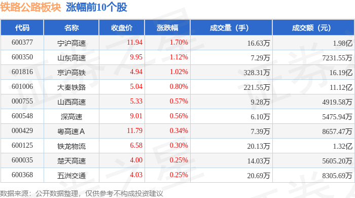 证券之星消息,1月26日铁路公路板块较上一交易日上涨0.41%,宁沪高速领涨。当日上证指数报收于 4132.61,下跌0.09%。深证成指报收于14316.64,下跌0.85%。铁路公路板块个股涨跌见下表: | 代码 | 名称 | 收盘价 | 涨跌幅 | 成交量(手) | 成交额(元) | | | --- | --- | --- | --- | --- | --- | --- | | 600377 | 宁沪高速 | 11.94 | 1.70% | 16.63万 | | 1.9867 | | 600350 | 山东高速 | 9.95 | 1.12% | | 7.29万 | 7231.55万 | | 601816 | 京沪高铁 | 4.94 | 1.02% | 328.31万 | | 16.19亿 | | 601006 | 大奏铁路 | 5.04 | 0.80% | 221.55万 | | 11.12亿 | | 000755 | 山西高速 | 5.33 | 0.57% | | 9.28万 | 4919.58万 | | 600548 | 深高速 | 9.01 | 0.56% | | 6.10万 | 5475.94万 ...