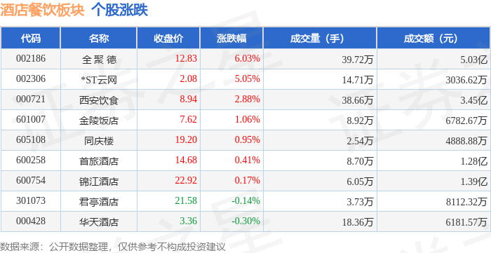Core Insights - The hotel and catering sector experienced a 1.0% increase on November 3, with *ST Yunwang leading the gains [1] - The Shanghai Composite Index closed at 3976.52, up 0.55%, while the Shenzhen Component Index closed at 13404.06, up 0.19% [1] Sector Performance - The following table summarizes the performance of key stocks in the hotel and catering sector: | Code | Name | Closing Price | Change (%) | Volume (10,000) | Turnover (Million) | |--------|--------------|---------------|------------|------------------|---------------------| | 002306 | *ST Yunwang | 1.93 | 3.21% | 45.20 | 87.83 | | 600754 | Jinjiang Hotel| 23.06 | 2.44% | 18.16 | 414.00 | | 000721 | Xi'an Catering| 8.75 | 1.86% | 13.84 | 120.00 | | 000428 | Huaten Hotel | 3.31 | 1.53% | 20.52 | 67.77 | | 002186 | Quanjude | 11.60 | 0.78% | 4.96 | 57.26 | | 301073 | Junxi Hotel | 21.61 | 0.56% | 2.90 | 62.48 | | 601007 | Jinling Hotel | 7.45 | -0.13% | 7.33 | 54.66 | | 600258 | Shoulv Hotel | 14.46 | -0.48% | 9.53 | 138.00 | | 605108 | Tongqinglou | 18.78 | -0.69% | 1.88 | 35.35 | [1] Capital Flow - The hotel and catering sector saw a net inflow of 5.90 million yuan from main funds, while retail investors experienced a net outflow of 55.97 million yuan [1] - The following table details the capital flow for key stocks: | Code | Name | Main Net Inflow (Million) | Main Net Ratio (%) | Speculative Net Inflow (Million) | Speculative Net Ratio (%) | Retail Net Inflow (Million) | Retail Net Ratio (%) | |--------|--------------|---------------------------|---------------------|----------------------------------|---------------------------|-----------------------------|-----------------------| | 600754 | Jinjiang Hotel| 15.99 | 4.85 | 1.53 | 0.46 | -17.51 | -5.31 | | 600258 | Shoulv Hotel | 6.32 | 5.53 | 4.25 | 3.72 | -10.57 | -9.25 | | 002306 | *ST Yunwang | 4.97 | 6.44 | -0.49 | -0.63 | -4.48 | -5.81 | | 000721 | Xi'an Catering | 1.28 | 1.75 | 0.28 | 0.38 | -1.56 | -2.13 | | 002186 | Quanjude | -1.83 | -3.74 | -0.20 | -0.42 | 2.03 | 4.16 | | 301073 | Junxi Hotel | -2.41 | -4.62 | -1.75 | -3.35 | 4.16 | 7.97 | | 605108 | Tongqinglou | -4.92 | -16.21 | -1.22 | -4.01 | 6.13 | 20.22 | | 000428 | Huaten Hotel | -5.30 | -9.07 | -1.37 | -2.35 | 6.67 | 11.42 | | 601007 | Jinling Hotel | -8.20 | -18.79 | -1.33 | -3.05 | 9.53 | 21.84 | [2]