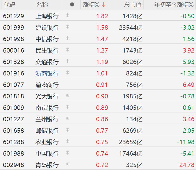| 代码 | 名称 | | 涨幅% ↓ | 总市值 | 年初至今涨幅%。 | | --- | --- | --- | --- | --- | --- | | 601229 | 上海银行 | 1 | 1.82 | 1428亿 | -0.50 | | 601939 | 建设银行 | 1 | 1.58 | 23544亿 | -3.02 | | 601998 | 中信銀行 | 1 | 1.47 | 4218亿 | -1.56 | | 600016 | 民生银行 | 1 | 1.27 | 1743亿 | 3.92 | | 601328 | 交通银行 | 1 | 1.19 | 6026 乙 | -5.93 | | 601916 | 浙商银行 | 1 | 1.01 | 824亿 | -1.32 | | 601077 | 渝农商行 | | 0.91 | 756亿 | 6.49 | | 601818 | 光大银行 | 安 | 0.90 | 1985 Z | -0.78 | | 6000009 | 南京银行 | 1 | 0.89 | 1405亿 | -0.61 | | 001227 | 兰州银行 | 楽 | 0.86 | 134 ...