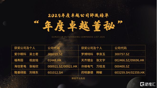 12月22日,格隆汇在线上举办"科技赋能·资本破局"分享会。本次分享会,备受瞩目的卓越公司评选榜 单将隆重揭晓,其中格隆汇"金格奖"年度卓越公司评选中,爱尔眼科(300015.SZ)吴士君、福寿园 (01448.HK)祝启铭、海信家电(000921.SZ/00921.HK)张裕欣、隆基绿能(601012.SH)刘晓东、罗博特科 (300757.SZ)李良玉、天齐锂业(002466.SZ/09696.HK)张文宇、许继电气(000400.SZ)万桂龙、药明康德 (603259.SH/02359.HK)韩敏8位荣获"年度卓越董秘"奖项。(排名不分先后,按公司首部字母顺序排 列) "年度卓越董秘"奖项旨在表彰在负责公司治理、股权事务管理、信息披露、投资者关系等层面表现突出 的上市公司董秘。该奖项体现出市场与投资者对董秘长期坚持公司规范化运作、及时合规信披、保障股 东公平知情权,以及保持稳健发展并持续维股东创造价值的高度认可。本次评选通过定量数据分析和专 家评审团等方式得出最终结果。 格隆汇以"全球视野,下注中国"为初衷,本次评选旨在打造出投资圈中最具参考价值的上市公司及独角 兽公司排行榜。此次"金格奖"上市公司评选 ...