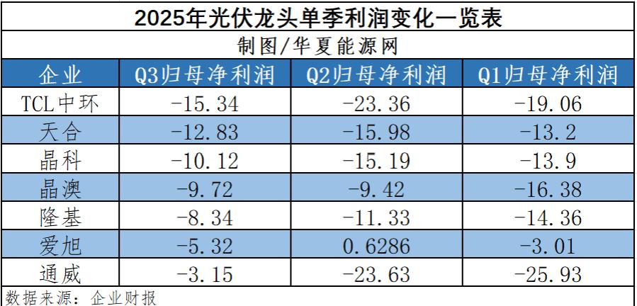 截至10月31日,A股上市光伏公司均完成了三季报的公布。整体来看,亏损仍是行业主旋律。 华夏能源网(公众号hxny3060)统计,今年第三季度,隆基绿能(SH:601012)、晶科能源(SH:688223)、天合光能(SH:688599)、晶 澳科技(SZ:002459)、通威股份(SH:600438)、TCL中环(SZ:002129)以及爱旭股份(SH:600732)7家龙头合计亏损64.82亿元。前三季 度,这7家企业更是合计亏损了269.27亿元。 不过可喜的是,相比上半年,这7家龙头企业中的多数已经减亏,且减亏幅度明显增大。 龙头企业具有很强的标杆意义。这表明整个光伏行业已走在触底回稳的路上,光伏行业的转折点已然来临。 龙头减亏力度显著大于上半年 在隆基绿能、晶科能源、天合光能、晶澳科技、通威股份、TCL中环和爱旭股份这7家龙头企业中,今年第三季度,有3家的单 季亏损超10亿。分别是,TCL中环亏损15.34亿元,天合光能亏损12.83亿元,晶科能源亏损10.12亿元。此外隆基绿能、通威股份 分别亏损了8.34亿元和3.15亿元。 | | | 2025年光伏龙头单季利润变化一览表 | | | --- ...