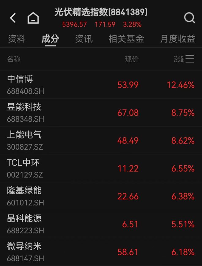11月14日,光伏板块午后短线拉升,隆基绿能一度涨超8%,截至发稿,中信博涨超12%,上能电气涨超8%,隆基绿能、 TCL中环 涨超6%,微导纳 米、晶科能源等纷纷走高。 对于交易总金额等细节,隆基绿能方面暂未透露。此前,在光伏组件出货排名前四的企业中,隆基绿能是唯一未布局储能业务的公司。 编辑丨瑜见 | < ロ | 光伏精选指数[8841389] | | Q | | --- | --- | --- | --- | | | 5396.57 171.59 3.28% | | | | 资料 | 成分 | 相关基金 | 月度收益 | | 名称 | | 现价 | 涨跌一 | | 中信博 | | 53.99 | 12.46% | | 688408.SH | | | | | 昱能科技 | | 67.08 | 8.75% | | 688348.SH | | | | | 上能电气 | | 48.49 | 8.62% | | 300827.SZ | | | | | TCL中环 | | 11.22 | 6.55% | | 002129.SZ | | | | | 隆基绿能 | | 22.66 | 6.38% | | 601012. ...