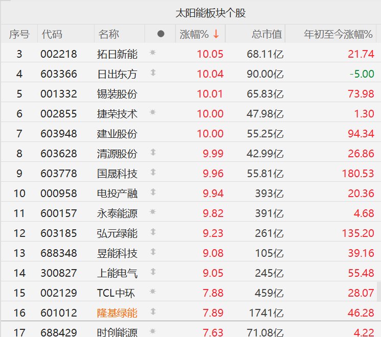格隆汇11月14日|A股市场太阳能概念股走强,其中,拓日新能、日出东方、锡装股份、捷荣技术、建业股份、清源股份、国晟 科技(维权)、电投产融涨停,永泰能源、弘元绿能、昱能科技、上能电气涨超9%,TCL中环、隆基绿能、时创能源涨超7%。 有数据显示,中国是全球电力增长的主要贡献者,新增电力供应中约有四分之三来自太阳能。马斯克在社交平台转发推文并 称,太阳能发电将成为迄今为止人类文明最大的能源来源。 | | | | | 太阳能板块个股 | | | | --- | --- | --- | --- | --- | --- | --- | | 序号 | 代码 | 名称 | | 涨幅% ↓ | 总市值 | 年初至今涨幅% | | 3 | 002218 | 拓日新能 | 来 | 10.05 | 68.11亿 | 21.74 | | 4 | 603366 | 日出东方 | 1 | 10.04 | 90.00亿 | -5.00 | | 5 | 001332 | 锡装股份 | | 10.01 | 65.83 Z | 73.98 | | 6 | 002855 | 捷荣技术 | -08- | 10.00 | 47.98 Z | 1. ...