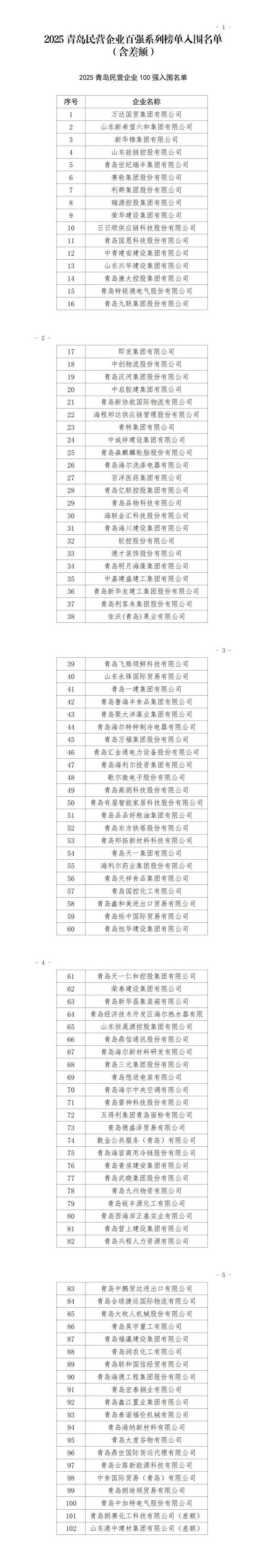 关于对2025青岛民营企业百强系列榜单入围名单公示的公告 来源:观海新闻 为深入贯彻习近平新时代中国特色社会主义思想和党的二十大及二十届二中、三中全会精神,贯彻落实习近平总书记在民营企业座谈会 上的重要讲话精神,助力全市民营经济高质量发展,市工商联、市发展改革委、市科技局、市工业和信息化局、市人力资源和社会保障 局、市农业农村局、市商务局、市市场监管局、市民营经济局、市税务局共同组织开展2025青岛民营企业百强系列榜单评选发布活动。 活动启动以来,按照企业申报、各区市推荐、部门审核、征求成员单位意见等规定程序,参考2025山东民营企业百强系列榜单评选成 果,形成2025青岛民营企业百强系列榜单入围名单(含差额)。现将该名单予以公示,接受社会各界监督,公示期为2025年10月13日至 10月17日。入围企业若存在重大违法失信行为或其他不符合参评条件的问题,请在公示期内反映。 | 序号 | 企业名称 | | --- | --- | | 1 | 万达国贸集团有限公司 | | 2 | 山东新希望六和集团有限公司 | | 3 | 新华锦集团有限公司 | | 4 | 山东能链控股有限公司 | | 5 | 青岛世纪瑞丰集团 ...