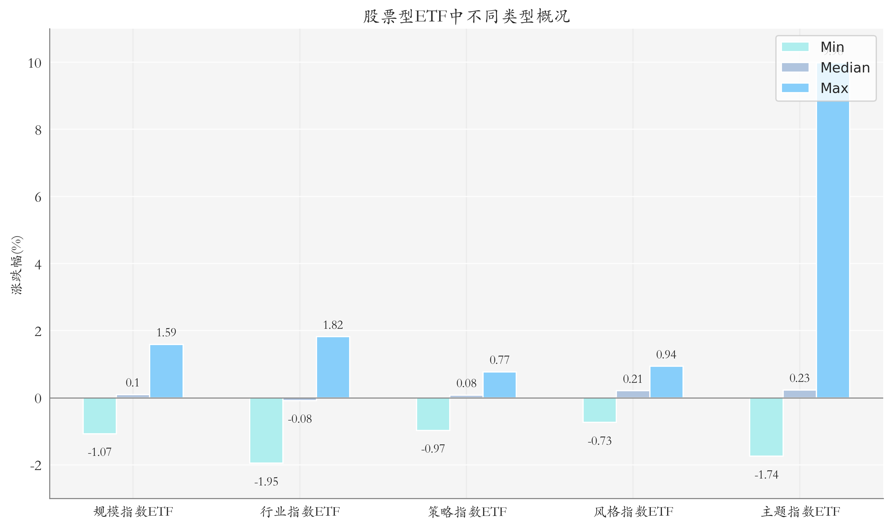一、证券市场回顾 南财金融终端数据显示,昨日(2月10日,下同)上证综指日内上涨0.13%,收于4128.37点,最高4134.34点;深证成指日内上涨0.02%,收于14210.63点,最高 14258.51点;创业板指日内下跌0.37%,收于3320.54点,最高3348.48点。 二、ETF市场表现 1、股票型ETF整体市场表现 昨日股票型ETF资金流入最多的3只ETF及其流入金额分别为:国泰中证影视主题ETF(流入7.2亿元)、银华中证影视主题ETF(流入6.19亿元)、华夏中证 机器人ETF(流入5.27亿元)。资金流入前10详情见下表: 昨日股票型ETF收益率中位数为0.14%。其中按照不同分类,规模指数ETF中平安上证科创板50成份ETF收益率最高,为1.59%;行业指数ETF中易方达中证 家电龙头ETF收益率最高,为1.82%;策略指数ETF中银河上证国有企业红利ETF收益率最高,为0.77%;风格指数ETF中国寿安保国证创业板中盘精选 88ETF收益率最高,为0.94%;主题指数ETF中银华中证影视主题ETF收益率最高,为9.98%。 2、股票型ETF涨跌幅排行 昨日股票型ETF涨幅最高的3 ...