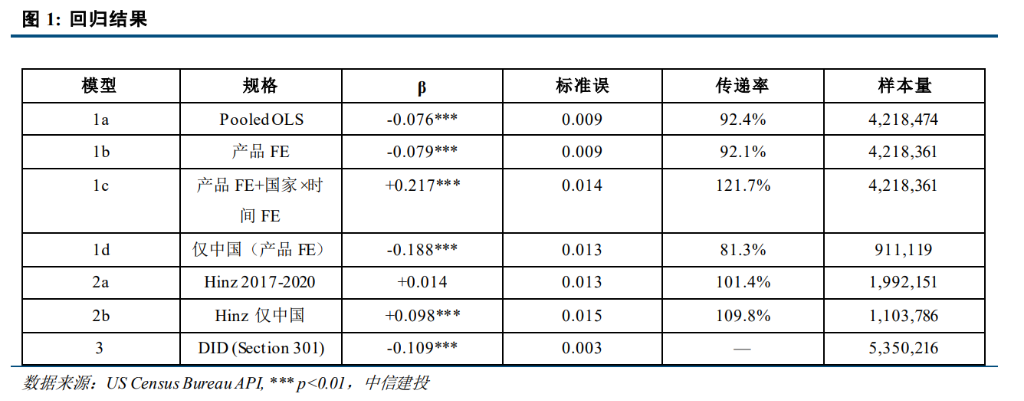 市场长久以来一直存在一个幻想:高额关税将迫使外国出口商流血降价,从而保护美国国内经济。然而,中信建投(CSC)指出:在这场关税博弈中, 买单的是美国进口商,并最终是美国消费者。 第一层传导:出口商拒不降价,美国进口商吞下92%关税成本 研报第一部分直击核心:关税成本到底在谁身上?中信建投基于HS10位级别进口数据,构建了一个包含535万观测值(涵盖8国、20,868种产品、跨度 108个月至2025年12月)的庞大面板数据集。 回归模型得出的基准结论是:β≈−0.08β≈−0.08,即传递率约92%。关税每增加1个百分点,出口商平均仅微降0.08个百分点。出口商仅吸收了8%的冲 击,剩余92%全部砸在美国买家头上。 分国别来看,数据更加令人瞩目: | 模型 | 规格 | B | 标准误 | 传递率 | 样本量 | | --- | --- | --- | --- | --- | --- | | l a | Pooled OLS | -0.076*** | 0.009 | 92.4% | 4,218,474 | | l P | 产品 FE | -0.079*** | 0.009 | 92.1% | 4,218,3 ...