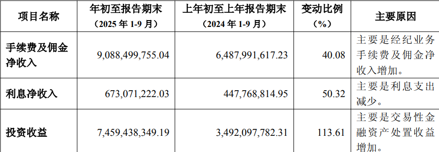 Core Insights - The performance of brokerage stocks is increasingly noteworthy, with CITIC Securities reporting significant growth in its latest earnings announcement [1] - The company achieved a revenue of 6.549 billion yuan in Q3, a year-on-year increase of 55.29%, and a net profit of 2.580 billion yuan, up 79.21% [1] - For the first three quarters, CITIC Securities reported a total revenue of 17.289 billion yuan, reflecting a 31.25% year-on-year growth, and a net profit of 7.089 billion yuan, which is a 64.95% increase [1] Revenue Breakdown - The growth in core indicators is attributed to increased investment income and net commission income [2] - Investment income surged over 100%, with the company recording 7.464 billion yuan in the first three quarters, a year-on-year increase of 113.61% [2] - The rise in investment income is primarily due to increased gains from the disposal of trading financial assets [2] Commission and Interest Income - The net commission income for the first nine months reached 9.089 billion yuan, a 40.08% increase compared to the previous year [3] - The net interest income also saw a significant rise, amounting to 673 million yuan, which is a 50.32% increase [5] - The notable growth in commission income reflects the active stock market and increased trading volumes [6] Brokerage and Investment Banking Performance - The brokerage business showed remarkable performance, with net commission income from brokerage services reaching 5.757 billion yuan, a 53.68% year-on-year increase [4] - The investment banking segment also demonstrated growth, with net income reaching 1.846 billion yuan, up 23.37% year-on-year, indicating a recovery in the company's underwriting business [7] - The asset management and fund management business remained stable, with a slight increase of 2.81%, totaling 950 million yuan [8]