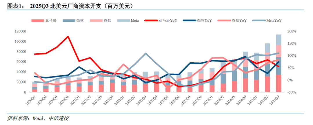 亚马逊(AMZN.US):2025Q3资本开支为350.95亿美元,同比增长55.15%。过去12个月新增数据中心容量超过3.8GW,2025Q4计划再增加1GW。公司预计 2025年全年资本支出将达到约1250亿美元,并将在2026年进一步增加,主要将流向AI所需的数据中心、电力和芯片。 微软(MSFT.US):2025Q3资本开支为349亿美元,同比增长74.5%,其中约一半用于短期资产(主要是GPU和 CPU),并持续更换报废服务器和网络设备。公 司计划今年将AI总容量增加80%以上,并在未来两年内将数据中心总占地面积增加约一倍。 谷歌(GOOG.US):2025Q3资本开支为239.53亿美元,同比增长83.39%。绝大部分资本支出投资于技术基础设施,其中约60%投资于服务器,40%投资于数 据中心和网络设备。预计2025年的资本支出将在910亿美元至930亿美元之间,高于此前850亿美元的预期。展望2026年,公司预计资本支出将大幅增长。 智通财经APP获悉,中信建投发布研报称,北美四家CSP厂商陆续公布三季报,资本开支加速增长,同时各家对未来基础设施投资均继续保持积极态度。 短期内,在加单传闻、三 ...