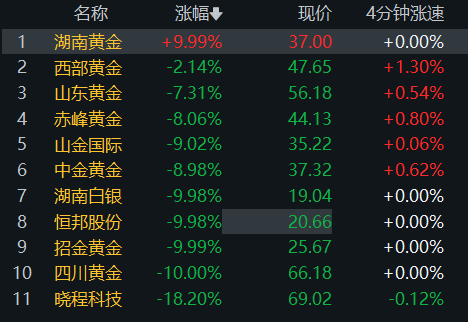 责编:李文玉 | 审核:李震 | 监审:古筝 | | 名称 | 米幅も | 现价 | 4分钟涨速 | | --- | --- | --- | --- | --- | | | 湖南黄金 | +9.99% | 37.00 | +0.00% | | 2 | 西部黄金 | -2.14% | 47.65 | +1.30% | | 3 | 山东黄金 | -7.31% | 56.18 | +0.54% | | 4 | 赤峰黄金 | -8.06% | 44.13 | +0.80% | | 5 | 山令国际 | -9.02% | 35.22 | +0.06% | | 6 | 中金黄金 | -8.98% | 37.32 | +0.62% | | 7 | 湖南白银 | -9.98% | 19.04 | +0.00% | | 8 | 恒邦股份 | -9.98% | 20.66 | +0.00% | | 9 | 招金黄金 | -9.99% | 25.67 | +0.00% | | 10 | 四川黄金 | -10.00% | 66.18 | +0.00% | | 11 | 晓程科技 | -18.20% | 69.02 | -0.12% ...