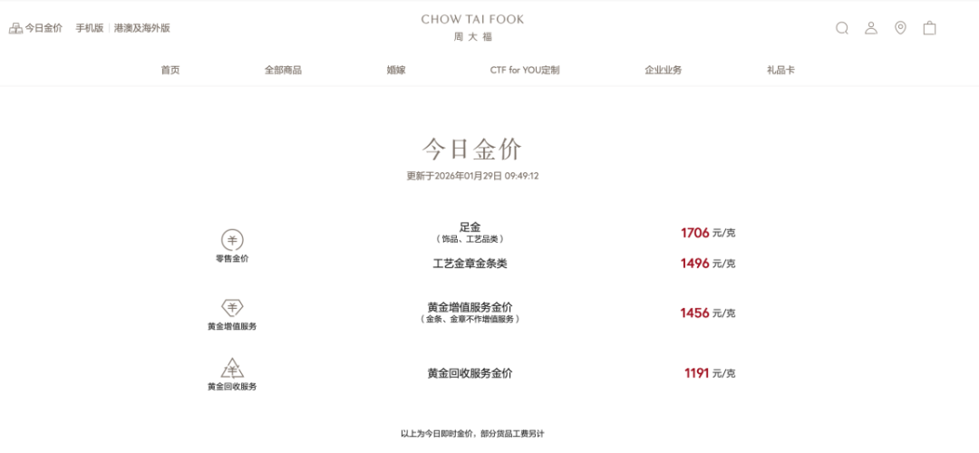 1月29日,国际金价再次大幅上涨。 现货、期货双双站上5500美元/盎司,其中,黄金期货一度突破5600美元/盎司关口。截至发稿,COMEX黄金报5549.5美元/盎司,上涨3.92%;伦敦金报 5528.377美元/盎司,上涨2.04%。 | | | 金价(人民币) | | --- | --- | --- | | 足金饰品(每克) | 委书 | ¥1708 | | | 换金价 | ¥1453 | | | 换珠宝价 | ¥1453 | | 工艺金片(每克) | 卖出 | ¥1500 | | 950铂金饰品(每克) | 愛田 | ¥1073 | | | 换金价 | ¥862 | | 生生金宝(每克) | 卖出 | ¥1500 | 随着国际金价一路狂飙,国内首饰金价再次大幅上涨,创下历史新高。 1月29日,多家金饰品牌足金报价突破1700元/克。其中,周大福报1706元/克,较昨日上涨88元/克;周生生报1708元/克,较昨日上涨94元/克;老庙黄金报 1706元/克,较昨日上涨94元/克;老凤祥报1713元/克,较昨日上涨93元/克。 | 品 今日金价 手机版 港澳及海外版 | | CHOW TAI FOOK ...
