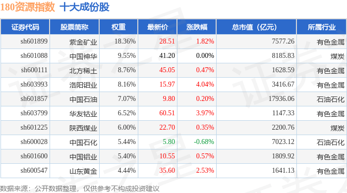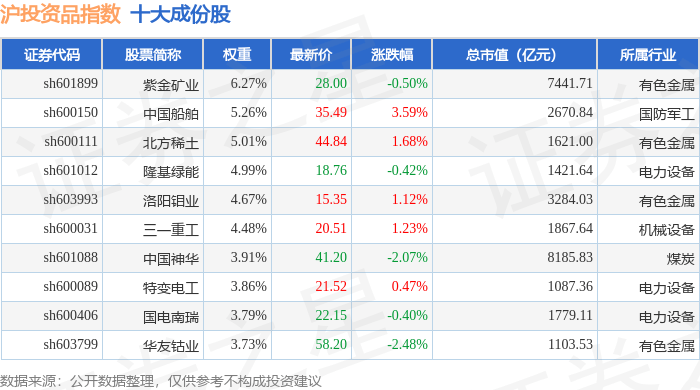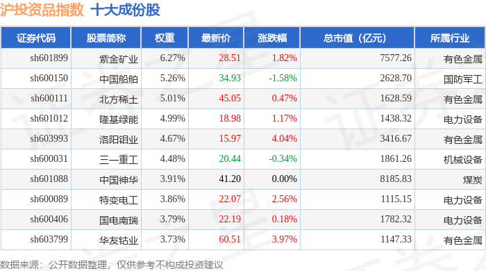 证券之星消息,11月24日,沪投资品(000102)指数报收于7055.9点,涨0.15%,成交619.14亿元,换手 率1.18%。当日该指数成份股中,上涨的有23家,阿特斯以4.57%的涨幅领涨,下跌的有26家,华友钴业 以2.48%的跌幅领跌。 沪投资品(000102)指数十大成份股详情如下: | 沪投资品指数 十大成份股 | | --- | | 证券代码 | 股票简称 | 权重 | 最新价 | 涨跌幅 | 总市值(亿元) | | 所属行业 | | --- | --- | --- | --- | --- | --- | --- | --- | | sh601899 | 紫金矿业 | 6.27% | 28.00 | -0.50% | | 7441.71 | 有色金属 | | sh600150 | 中国船舶 | 5.26% | 35.49 | 3.59% | | 2670.84 | 国防车】 | | sh600111 | 北方稀土 | 5.01% | 44.84 | 1.68% | 4. V | 1621.00 | 有色金属 | | sh601012 | 隆基绿能 | 4.99% | 18.76 | -0. ...