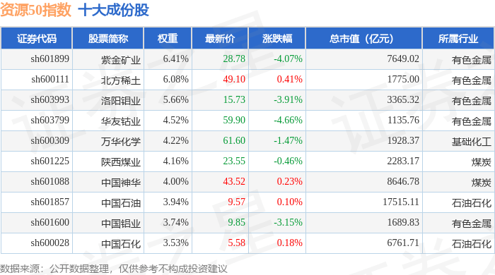 证券之星消息,11月4日,资源50(000092)指数报收于4454.84点,跌2.03%,成交595.15亿元,换手率0.68%。当日该指数成份股中,上涨的有9 家,平煤股份以0.82%的涨幅领涨,下跌的有40家,中金黄金以5.18%的跌幅领跌。 资源50(000092)指数十大成份股详情如下: | 证券代码 | 股票简称 | 权重 | 最新价 | 涨跌幅 | 总市值(亿元) | | 所属行业 | | --- | --- | --- | --- | --- | --- | --- | --- | | sh601899 | 紫金矿业 | 6.41% | 28.78 | -4.07% | | 7649.02 | > 有色全属 | | sh600111 | 北方稀土 | 6.08% | 49.10 | 0.41% | | 1775.00 | 有色全属 | | sh603993 | 溶脂铝业 | 5.66% | 15.73 | -3.91% | | 3365.32 | 有色金属 | | sh603799 | 华友钻V | 4.52% | 59.90 | -4.66% | | 1135.76 | 有色金属 | | s ...