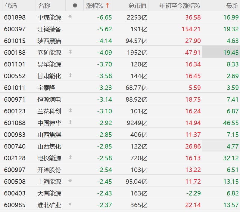 3月10日,受油价暴跌拖累,A股市场昨日逆势上涨的煤炭(核心股)股今日集体回调,其中,中煤能源跌超 6%,江钨装备跌超5%,陕西黑猫、兖矿能源跌超4%,昊华能源、甘肃能化、宝泰隆、恒源煤电、兰花科创跌超 3%,中国神华、山西焦煤、山西焦化、电投能源、开滦股份、上海能源、大有能源、淮北矿业跌超2%。 | 代码 | 名称 | | 涨幅% ↑ | 总市值 | 年初至今涨幅%。 | 最新 | | --- | --- | --- | --- | --- | --- | --- | | 601898 | 中煤源 | 家 | -6.65 | 2253亿 | 36.58 | 16.99 | | 600397 | 江铝装备 | | -5.62 | 191亿 | 154.21 | 19.32 | | 601015 | 陕西飘猫 | | -4.14 | 94.57亿 | 27.90 | 4.63 | | 600188 | 充矿能源 | 1 | -4.09 | 1952亿 | 47.91 | 19.45 | | 601101 | 景年能源 | | -3.70 | 120亿 | 16.34 | 8.33 | | 000552 | 日隷 ...