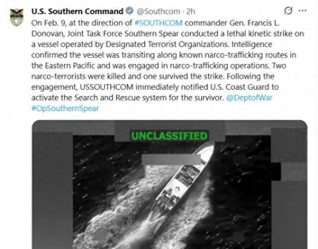 中新网2月10日电 据《纽约时报》报道,美军南方司令部当地时间9日称,在太平洋东部对一艘"贩毒 船"实施"致命打击",打死船上2人,有1名幸存者。 美军南方司令部还称,有情报显示,这艘船正"沿东太平洋已知的毒品走私路线航行,并从事毒品走私 活动"。此次行动打死船上2名"毒品恐怖分子",有1名幸存者。 图片来 源:美军南方司令部社交媒体截图 据报道,美军南方司令部在社交媒体上称,美军"南方之矛"联合特遣部队对一艘由"被认定的恐怖组 织"运营的船只实施"致命打击"。 报道称,美军南方司令部在帖文中附有一段大约11秒的视频,其中显示美军对一艘在海上行驶的船只进 行打击,船只发生巨大爆炸。 据此前报道,自2025年9月初以来,美军在加勒比海和东太平洋对美方指称的所谓"贩毒船"进行多次打 击,并于11月宣布发起"南方之矛"军事行动。然而,美国政府并未公布任何可以证明其攻击目标涉毒的 证据。 ...