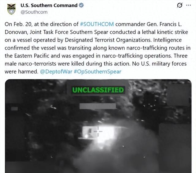 此前,美军南方司令部17日在社交媒体发布消息显示,美军16日晚在东太平洋和加勒比海袭击三艘美方 所谓"贩毒船",打死船上11人。 源:美军南方司令部社交媒体截图 消息称,2月20日,根据美军南方司令部司令弗朗西斯·多诺万的命令,美军"南方之矛"联合特遣部队对 美方所认定"恐怖组织"运营的船只实施"致命打击",打死3名"毒品恐怖分子"。 美军南方司令部还称,没有美军人员在这次打击中受伤。 据美媒报道,美军南方司令部20日在社交媒体上发文称,在东太平洋对一艘所谓"贩毒船"实施"致命打 击",打死船上3人。 自2025年9月初以来,美军在加勒比海和东太平洋频频袭击美方所谓的"贩毒船",并于11月13日宣布发 起"南方之矛"军事行动。然而,美国政府并未公布任何可以证明其攻击目标涉毒的证据。 来源:中国新闻网综合新华社、央视新闻、此前报道 图片来 ...