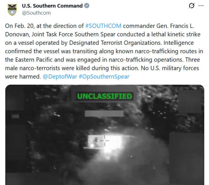 据美媒报道,美军南方司令部20日在社交媒体上发文称,在东太平洋对一艘所谓"贩毒船"实施"致命打 击",打死船上3人。 消息称,2月20日,根据美军南方司令部司令弗朗西斯·多诺万的命令,美军"南方之矛"联合特遣部队对 美方所认定"恐怖组织"运营的船只实施"致命打击",打死3名"毒品恐怖分子"。 美军南方司令部还称,没有美军人员在这次打击中受伤。 此前,美军南方司令部17日在社交媒体发布消息显示,美军16日晚在东太平洋和加勒比海袭击三艘美方 所谓"贩毒船",打死船上11人。 自2025年9月初以来,美军在加勒比海和东太平洋频频袭击美方所谓的"贩毒船",并于11月13日宣布发 起"南方之矛"军事行动。然而,美国政府并未公布任何可以证明其攻击目标涉毒的证据。 来源 | 中国新闻网综合新华社、央视新闻、此前报道 图片来 源:美军南方司令部社交媒体截图 ...