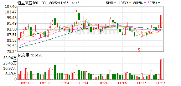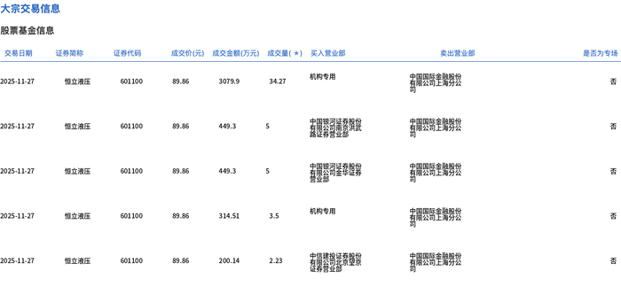 11月27日,恒立液压大宗交易成交50万股,成交额4493.15万元,占当日总成交额的1.4%,成交价89.86 元,较市场收盘价101.38元折价11.36%。 | 交易日期 | 证券商称 | 证券代码 | | | 成交价(元) 成交金额(万元) 成交量(*) 买入营业部 | | 舞出管业部 | 是否为专场 | | --- | --- | --- | --- | --- | --- | --- | --- | --- | | 2025-11-27 | 恒立液压 | 601100 | 89.86 | 3079.9 | 34.27 | 机构专用 | 看周公司 198 | 图 | | 2025-11-27 | 恒立液压 | 601100 | 89.86 | 449.3 | દે | | 量增及制正式分裂 | Ka | | 2025-11-27 | 恒立液压 | 601100 | 89.86 | 449.3 | 5 | 有關公司 在线路 | 有限公司主持分裂 | 물 | | 2025-11-27 | 恒立液压 | 601100 | 89.86 | 314.51 | 3.5 | 机构专用 | 君園公筒主婦努怒 | 播 ...