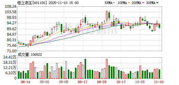 资金流向方面,主力资金净流出1507.14万元,特大单买入1425.75万元,占比6.57%,卖出2254.18万 元,占比10.38%;大单买入4025.67万元,占比18.54%,卖出4704.38万元,占比21.67%。 恒立液压今年以来股价涨70.27%,近5个交易日跌1.27%,近20日跌3.68%,近60日涨14.73%。 资料显示,江苏恒立液压股份有限公司位于江苏省常州市武进高新区龙潜路99号,成立日期2005年6月2 日,上市日期2011年10月28日,公司主营业务涉及高压油缸的研发、生产和销售。主营业务收入构成 为:液压油缸50.70%,液压泵阀及马达38.16%,配件及铸件7.28%,液压系统3.16%,其他(补 充)0.69%。 恒立液压所属申万行业为:机械设备-工程机械-工程机械器件。所属概念板块包括:工业4.0、大盘、基 金重仓、机械、融资融券等。 11月11日,恒立液压盘中下跌2.01%,截至10:49,报88.66元/股,成交2.17亿元,换手率0.18%,总市值 1188.77亿元。 截至9月30日,恒立液压股东户数3.69万,较上期减少15.76%;人均流通股36379股,较 ...