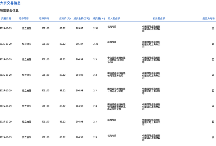 Summary of Key Points Core Viewpoint - On October 29, Hengli Hydraulic executed a block trade of 3.3863 million shares, amounting to 302 million yuan, which accounted for 17.25% of the total trading volume for the day. The transaction price was 89.12 yuan, representing a discount of 9.81% compared to the market closing price of 98.81 yuan [1]. Trading Details - The block trade involved a total of 3.3863 million shares at a price of 89.12 yuan per share, resulting in a total transaction value of 302 million yuan [1]. - The transaction price of 89.12 yuan was significantly lower than the market closing price, indicating a notable discount of 9.81% [1]. - The trading volume of 3.3863 million shares represents a substantial portion of the day's total trading activity, highlighting the significance of this transaction in the market context [1]. Institutional Participation - The block trade was primarily executed by institutional investors, indicating strong interest from professional market participants [2][3][4]. - Various institutional trading desks were involved in the transaction, suggesting a coordinated effort among multiple entities to acquire shares at the discounted price [2][3][4].