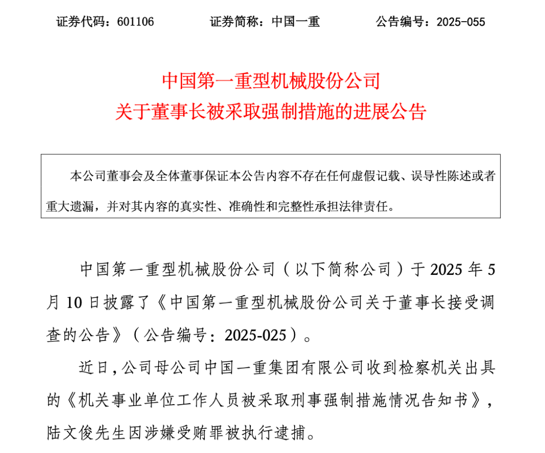 登录新浪财经APP 搜索【信披】查看更多考评等级 本公司董事会及全体董事保证本公告内容不存在任何虚假记载、误导性陈述或者重大遗漏,并对其内容 的真实性、准确性和完整性承担法律责任。 中国第一重型机械股份公司(以下简称公司)于2025年5月10日披露了《中国第一重型机械股份公司关 于董事长接受调查的公告》(公告编号:2025-025)。 近日,公司母公司中国一重集团有限公司收到检察机关出具的《机关事业单位工作人员被采取刑事强制 措施情况告知书》,陆文俊先生因涉嫌受贿罪被执行逮捕。 2025年11月19日 证券代码:601106 证券简称:中国一重 公告编号:2025-055 中国第一重型机械股份公司 关于董事长被采取强制措施的进展公告 目前公司生产经营正常,公司按照《中华人民共和国公司法》、《上海证券交易所股票上市规则》、 《上市公司治理准则》及《公司章程》等法律法规和相关制度规范运作。截至本公告披露日,公司董事 会运作正常,董事长及公司法定代表人职责由董事张文平先生代行,日常经营管理由高管团队负责。公 司及下属子公司生产经营情况正常。公司将持续关注该事项的后续进展,并按照有关法律法规的规定和 要求,及时履行信 ...