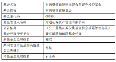 中国经济网北京2月24日讯 近日,财通资管公告,财通资管鑫锐混合、财通资管睿兴债券、财通资 管稳兴增益六个月持有期混合增聘陈浩。 财通资管稳兴增益六个月持有期混合A/C成立于2022年3月9日,截至2026年2月13日,其今年来收 益率为2.38%、2.33%,成立来收益率为11.87%、10.13%,累计净值为1.1187元、1.1013元。 | 基金名称 | 财通资管鑫锐回报混合型证券投资基金 | | --- | --- | | 基金简称 | 财通资管鑫锐混合 | | 基金主代码 | 004900 | | 基金管理人名称 | 财通证券资产管理有限公司 | | 公告依据 | 《公开募集证券投资基金信息披露管理办法》 | | 基金经理变更类型 | 兼有增聘和解聘基金经理 | | 新任基金经理姓名 | 陈浩 | | 共同管理本基金的其他基 | 马航 | | 金经理姓名 | | | 离任基金经理姓名 | 石玉山 | | 基金名称 | 财通资管率兴债券型证券投资基金 | | --- | --- | | 基金简称 | 财通资管率兴债券 | | 基金主代码 | 016432 | | 基金管理人名称 | 财通证券资产管理 ...