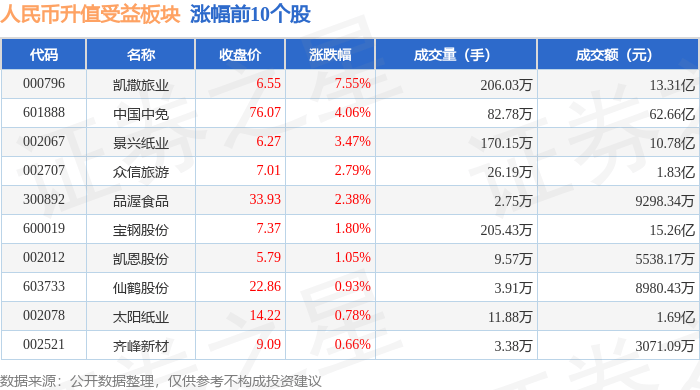 证券之星消息,10月31日人民币升值受益板块较上一交易日下跌0.27%,中国国航领跌。当日上证指数 报收于3954.79,下跌0.81%。深证成指报收于13378.21,下跌1.14%。人民币升值受益板块个股涨跌见下 表: | 代码 | 名称 | 收盘价 | 涨跌幅 | 成交量(手) | 成交额(元) | | --- | --- | --- | --- | --- | --- | | 000796 | 凯撒旅业 | 6.55 | 7.55% | 206.03万 | 13.31亿 | | 601888 | 中国中免 | 76.07 | 4.06% | 82.78万 | 62.66 Z | | 002067 | 置示能补 | 6.27 | 3.47% | 170.15万 | 10.78亿 | | 002707 | 众信旅游 | 7.01 | 2.79% | - 26.19万 | 1.83亿 | | 300892 | 铝酒食品 | 33.93 | 2.38% | 2.75万 | 9298.34万 | | 600019 | 宝钢股份 | 7.37 | 1.80% | 205.43万 | 15.26亿 | | 0020 ...