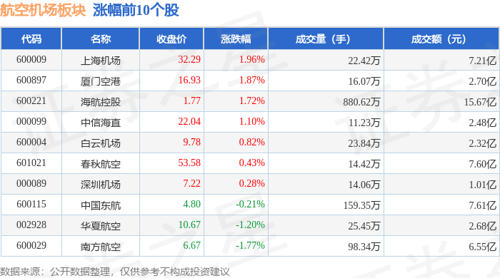 证券之星消息,10月31日航空机场板块较上一交易日下跌1.49%,中国国航领跌。当日上证指数报收于 3954.79,下跌0.81%。深证成指报收于13378.21,下跌1.14%。航空机场板块个股涨跌见下表: | 代码 | 名称 | 收盘价 | 涨跌幅 | 成交量(手) | | 成交额(元) | | --- | --- | --- | --- | --- | --- | --- | | 600009 | 上海机场 | 32.29 | 1.96% | | 22.42万 | 7.21亿 | | 600897 | 厦门空港 | 16.93 | 1.87% | | 16.07万 | 2.70亿 | | 600221 | 海航控股 | 1.77 | 1.72% | | 880.62万 | 15.67亿 | | 000099 | 中信海直 | 22.04 | 1.10% | | 11.23万 | 2.48亿 | | 600004 | 白云机场 | 9.78 | 0.82% | | 23.84万 | 2.32亿 | | 601021 | 春秋航空 | 53.58 | 0.43% | | 14.42万 | 7.60亿 | | ...