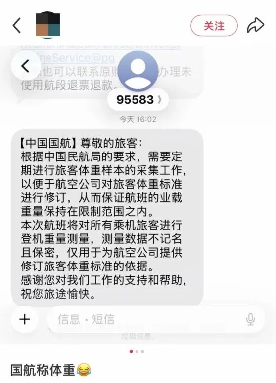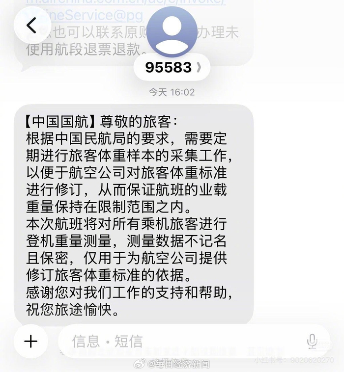 转自:今晚报 【#航司回应坐飞机要称体重#】近日,有网友发文称,乘坐中国国航的航班在登机前要现场称体重,引 发热议。其展示的航司短信中称,根据中国民航局要求,需定期进行旅客体重样本的采集工作,以便于 航空公司对旅客体重标准进行修订,"本次航班将对所有乘机旅客进行登机重量测量,测量数据不记名 且保密,仅用于为航空公司提供修订旅客体重标准的依据。"对此,2月6日,中国国际航空表示,称体 重是为了保证航班的业载重量保持在限制范围之内,"飞机承重是有上限的,可能是担心这个问题",对 于旅客体重情况不记名,"肯定会进行保密"。国航客服人员表示,目前对旅客没有体重方面的限制。评 论区中有网友表示,比较介意被他人看到自己的体重,能否选择不称重?对于称体重是否遵循自愿原 则,国航客服表示需查询后答复,发帖网友则回复称,"机场人员会询问,每个人都是自愿称重的,还 给了小礼物。" (中国新闻周刊)#过年前的工作强度# (来源:今晚报) ...