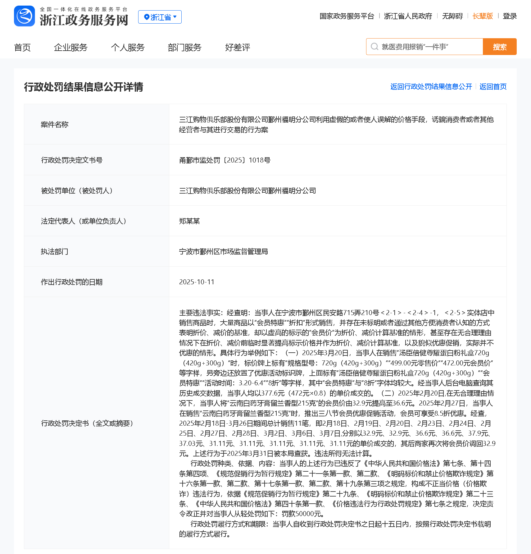 三江购物俱乐部股份有限公司是浙江省大型商贸流通企业,中国连锁经营百强企业。2020年被国家奖励办公室、中国商业联合会评选为全国商贸流通服务业 先进集体。公司董事长、创始人为十三五浙江省商贸行业优秀企业家。 近日,齐鲁晚报·齐鲁壹点记者从浙江政务服务网获悉,三江购物俱乐部股份有限公司鄞州福明分公司因利用虚假的或者使人误解的价格手段,诱骗消费者 或者其他经营者与其进行交易的行为案,被宁波市鄞州区市场监督管理局罚款50000元。 主要违法事实:经查明:当事人在宁波市鄞州区民安路715弄210号<2-1>-<2-4>-1,<2-5>实体店中销售商品时,大量商品以"会员特惠""折扣"形式销售,并 存在未标明或者通过其他方便消费者认知的方式表明折价、减价的基准,却以虚高的标示的"会员价"为折价、减价计算基准的情形,甚至存在无合理理由情 况下在折价、减价前临时显著提高标示价格并作为折价、减价计算基准,以及貌似优惠促销,实际并不优惠的情形。 | 三江简介 | | --- | | 企业文化 | | 公司大事记 | | 所获荣誉 | | 门庄—华丰 | 2011年,该公司在上海证券交易所挂牌上市(三江购物 601116)。 新闻 ...