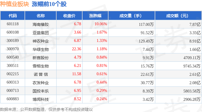证券之星消息,1月23日种植业板块较上一交易日上涨1.37%,海南橡胶领涨。当日上证指数报收于 4136.16,上涨0.33%。深证成指报收于14439.66,上涨0.79%。种植业板块个股涨跌见下表: | 代码 | 名称 | 收盘价 | 涨跌幅 | 成交量(手) | 成交额(元) | | --- | --- | --- | --- | --- | --- | | 603336 | 宏辉美疏 | 9.40 | -2.08% | 16.48万 | 1.56亿 | | 002772 | 众兴菌业 | 15.65 | -2.00% | 14.98万 | 2.34亿 | | 600598 | 北大荒 | 15.52 | -1.52% | 29.08万 | 4.53亿 | | 920403 | 康农种业 | 25.33 | -1.36% | - 3.51万 | 8862.77万 | | 002041 | 登海神』 | 9.89 | -0.50% | 11.86万 | 1.17亿 | | 600354 | 敦煌种业 | 6.82 | -0.44% | 23.03万 | 1.57亿 | | 920087 | 秋乐种业 | ...
